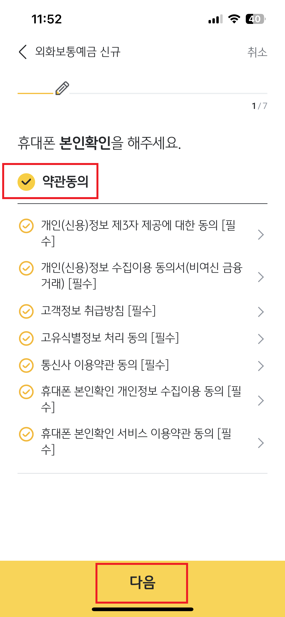 8. 휴대폰 본인확인을 위해 '약관동의 후 다음' 클릭