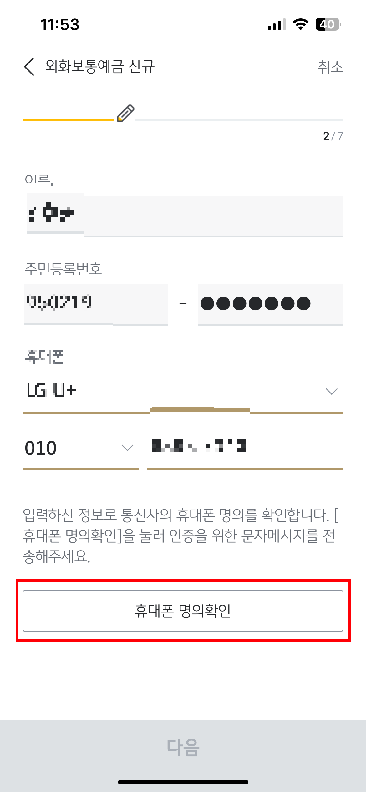 9. '휴대폰 명의 확인' 진행하여 완료해주세요.