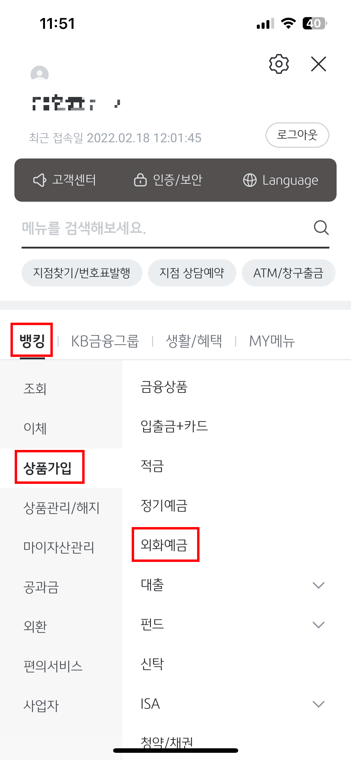2. '뱅킹' → '상품가입' → '외화예금' 클릭