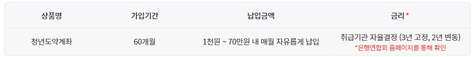 청년의 중장기 자산형성 지원을 위한 정책형 금융상품으로, 만기 5년(60개월) 동안 매월 70만원 한도 내에서 자유롭게 납입하면 매월 최대 6%의 정부기여금을 지급하고 이자소득에 대한 비과세 혜택을 제공하는 상품입니다.