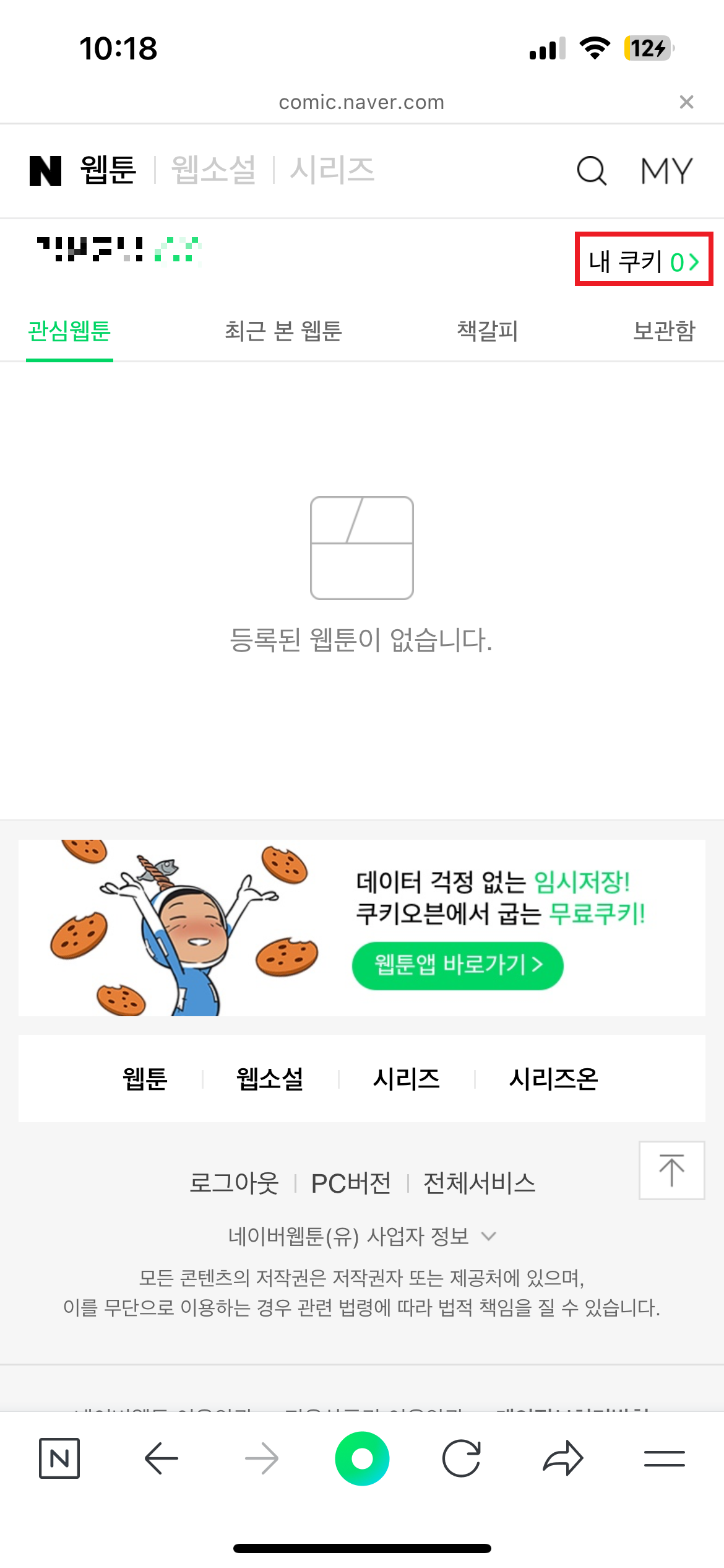 3. 우측 상단 MY 메뉴 클릭 → 우측 상단 내 쿠키 선택 → 쿠기 충전
