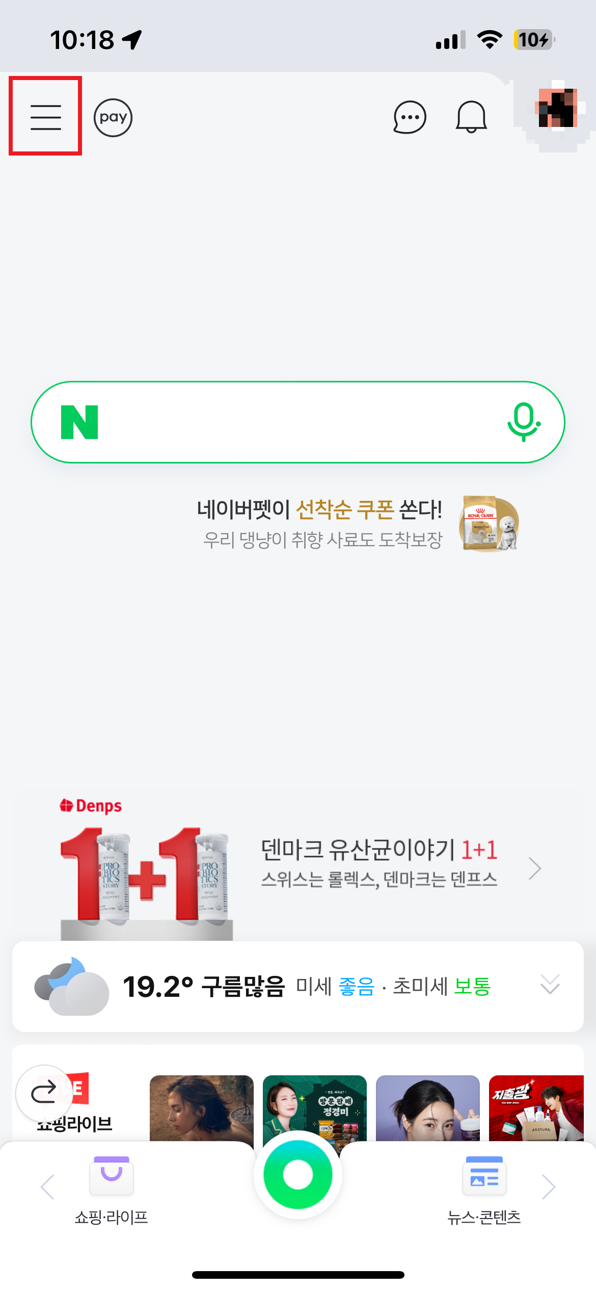 1. 네이버 어플로 접속 → 좌측 상단의 메뉴 클릭