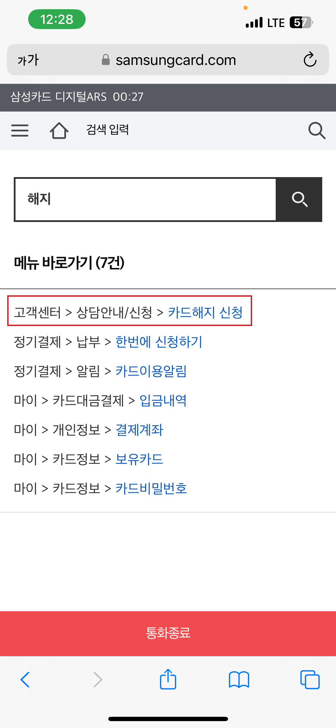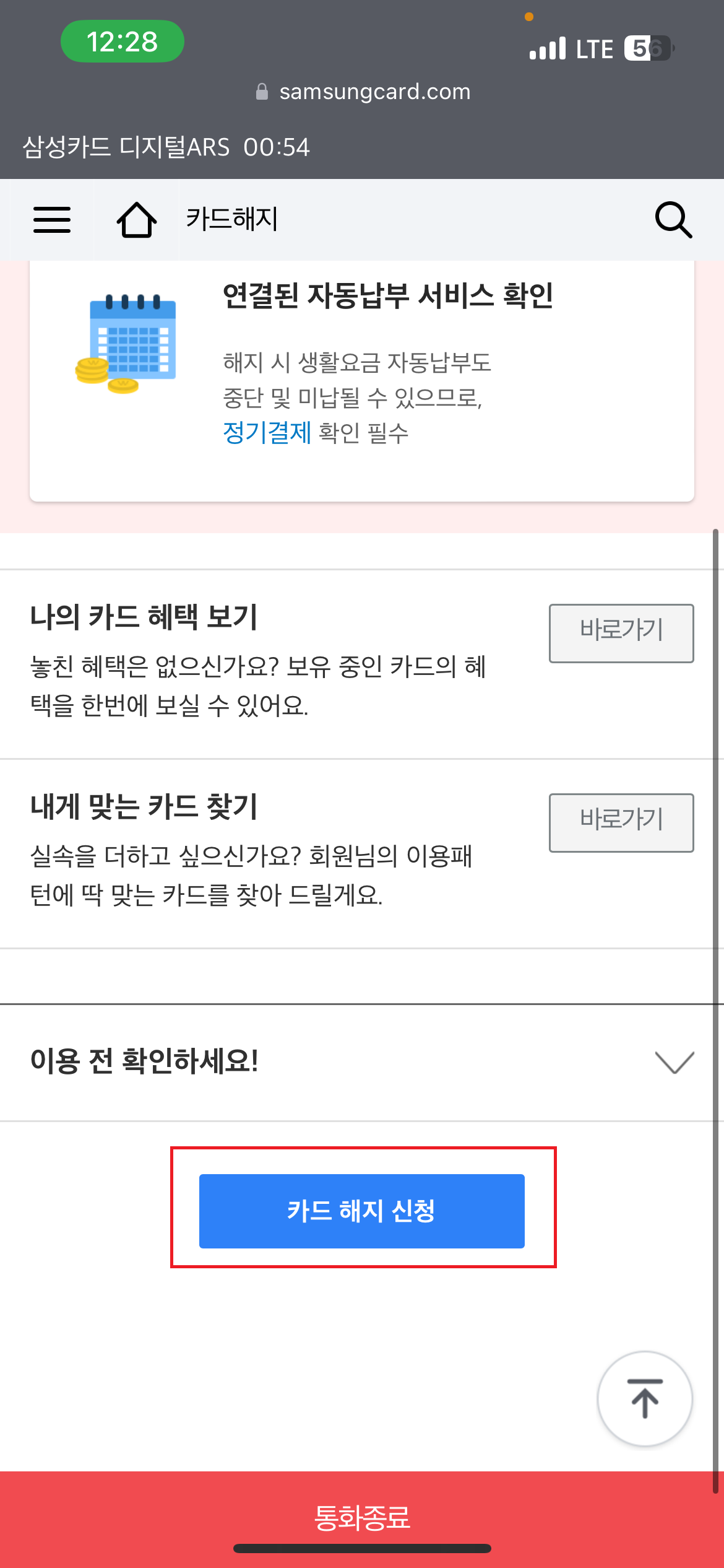과거에는 삼성카드 어플 메뉴에서 카드 해지 항목을 검색하여 바로 해지신청이 가능했지만, 현재는 사라져 별도로 찾아야합니다.
