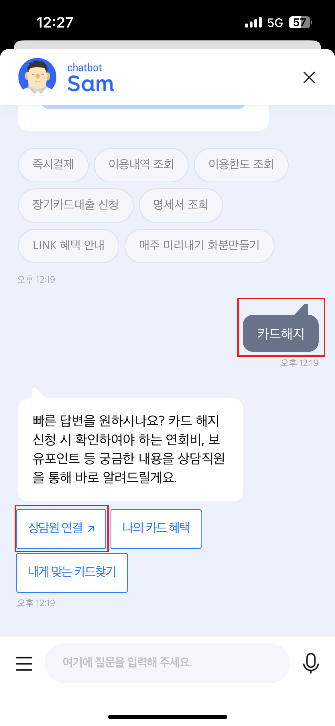1. 이전 방법과 동일하게 삼성카드 앱 접속 후 오른쪽 하단 아이콘 클릭 → '카드해지' 채팅 후 상담원 연결