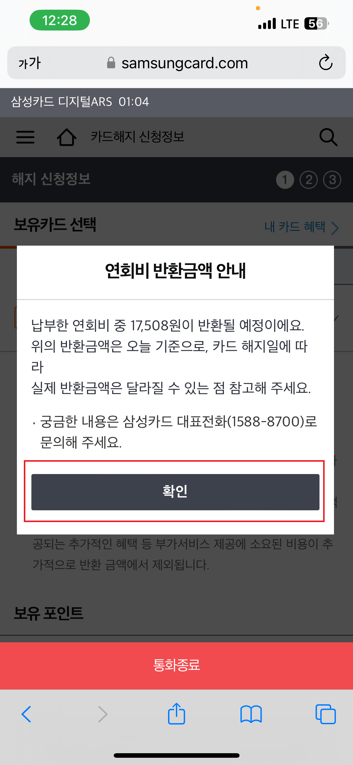 5. 해지하고자하는 카드 선택 → 연회비 반환금액 확인 후 카드해지