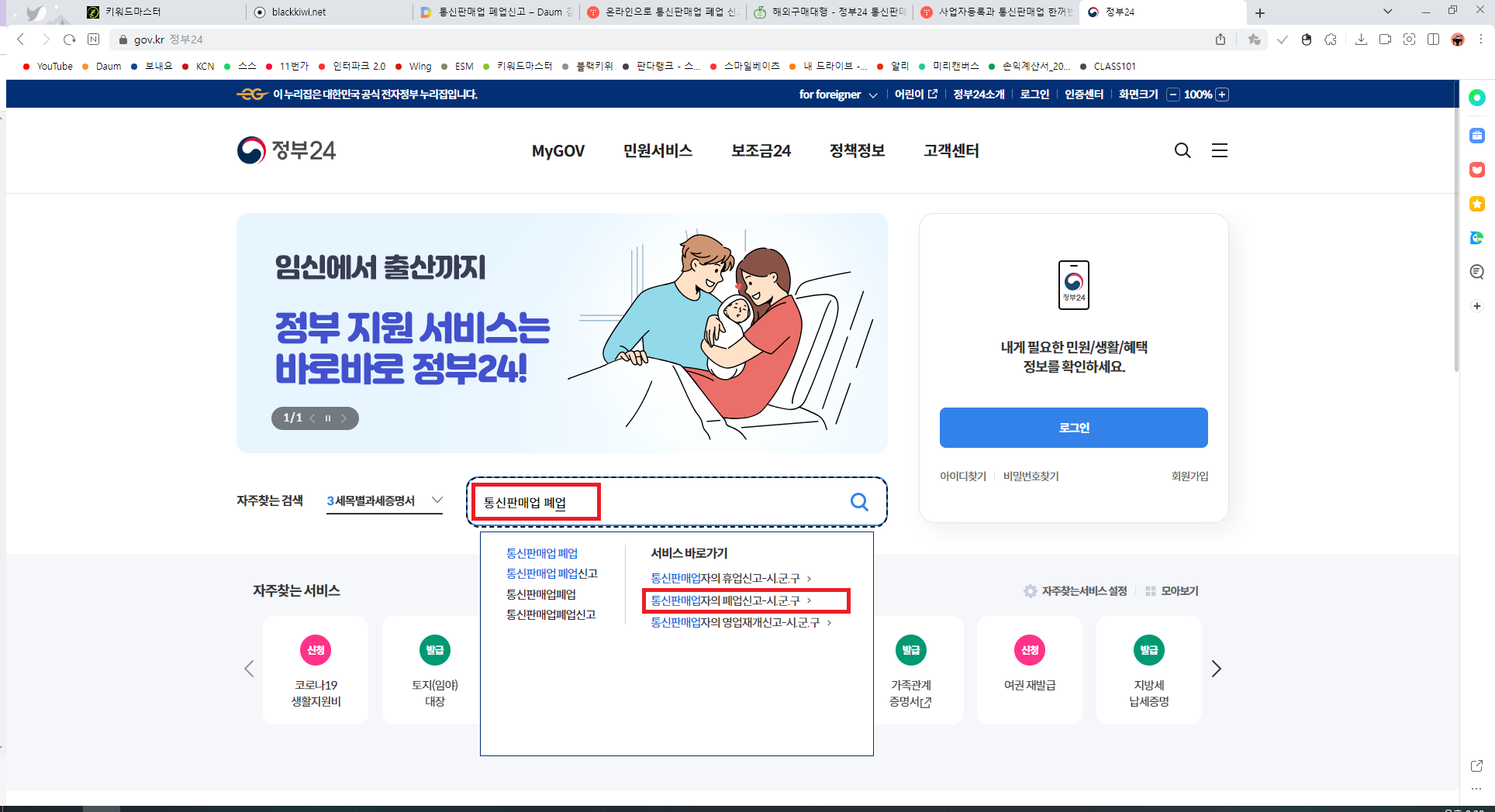 2. 로그인 후, 검색창에 통신판매업 폐업을 검색하면 아래와 같은 화면이 나오고 '통신판매업자의 폐업신고-시.군.구'를 선택해 주세요.