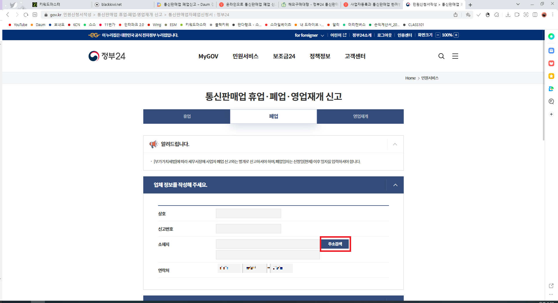 5.상호명과 신고번호, 소재지를 입력해주세요.