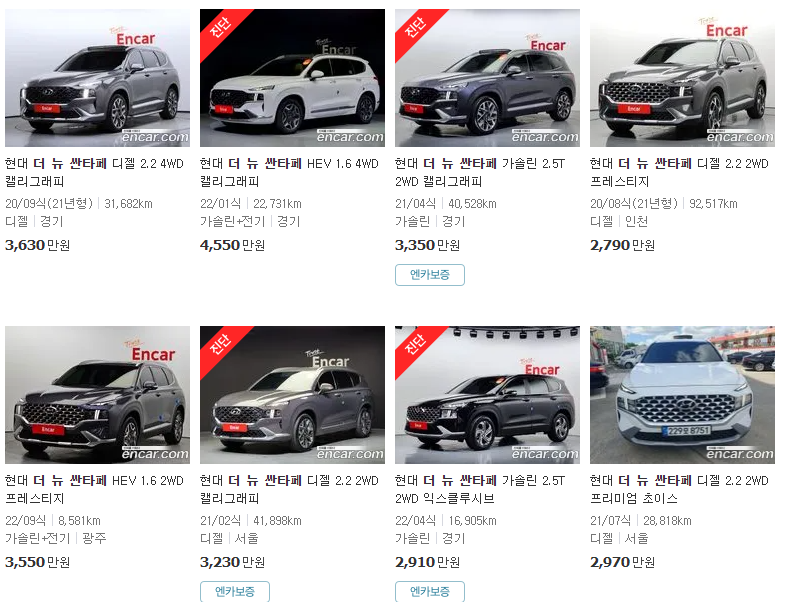 엔카는 거래가 많이 되는 국산차와 대중적인 차들의 등록대수가 많아 원하는 모델의 시세 파악하기 쉽습니다. 연식이 오래될수록, 주행거리가 많을수록 가격대는 떨어지기 마련인데 등록된 수많은 모델들의 시세를 통해 연식별 주행 거리별 시세를 익힐 수 있습니다.