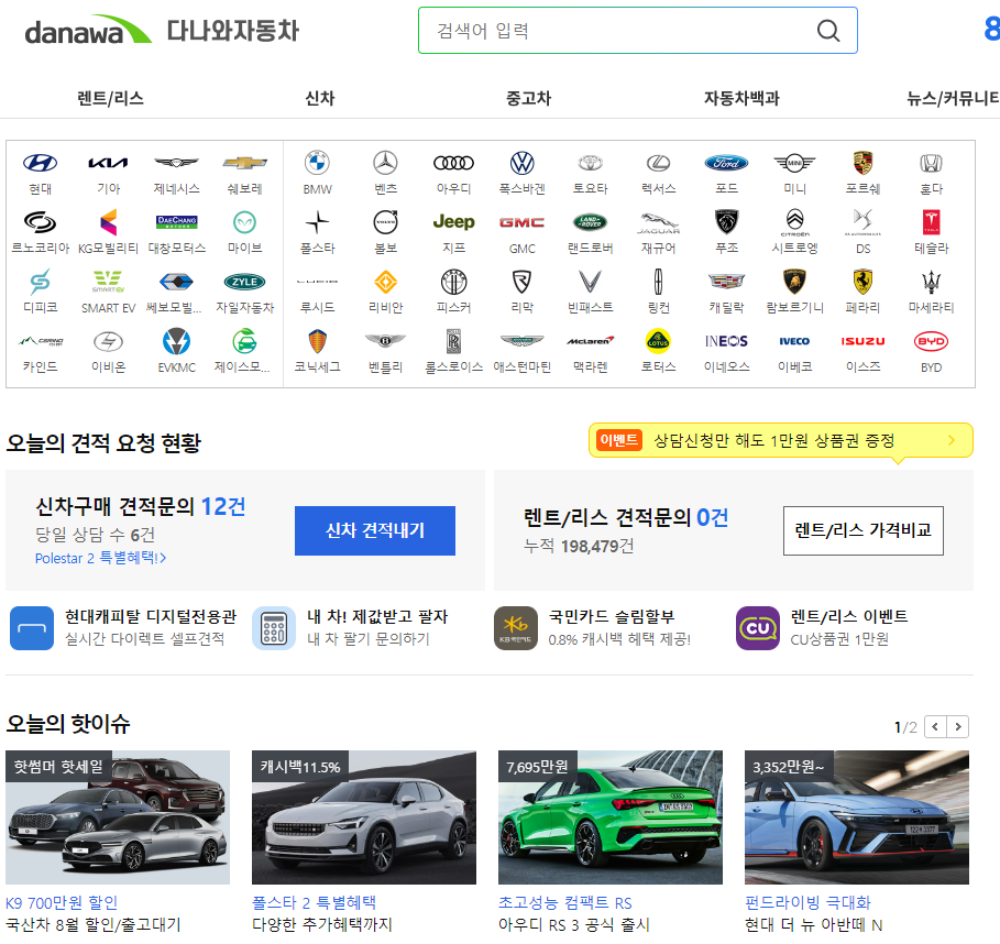 다나와자동차는 오픈 당시, 스마트 견적시스템 도입으로 신차 견적 문의글이 일평균 100건을 넘기며 많은 관심을 모은 중고차 사이트입니다. 다나와자동차에 등록된 중고 매물 대수는 많지 않은 편이지만 대부분 견적 문의로 많이 이용합니다