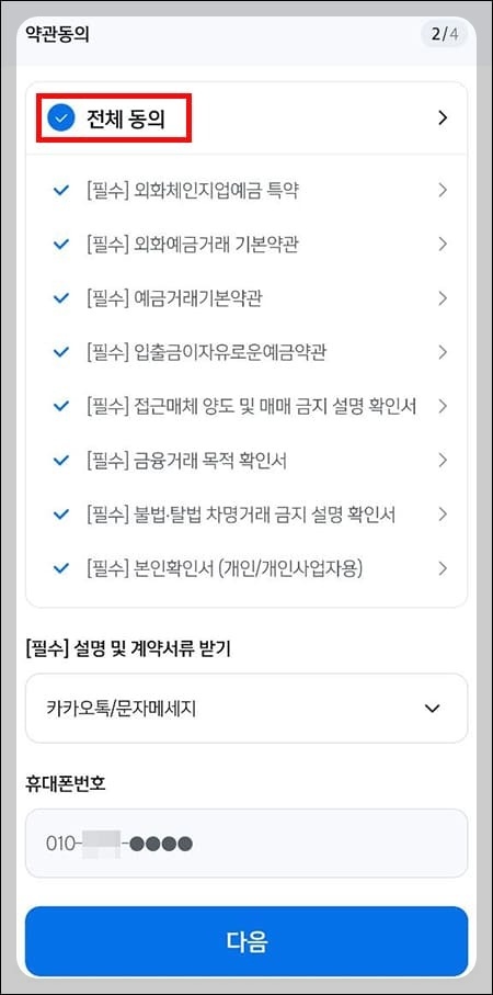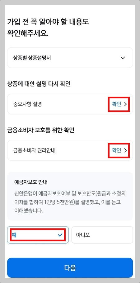 4)상품별 상품 설명서를 확인후 다음 버튼 클릭