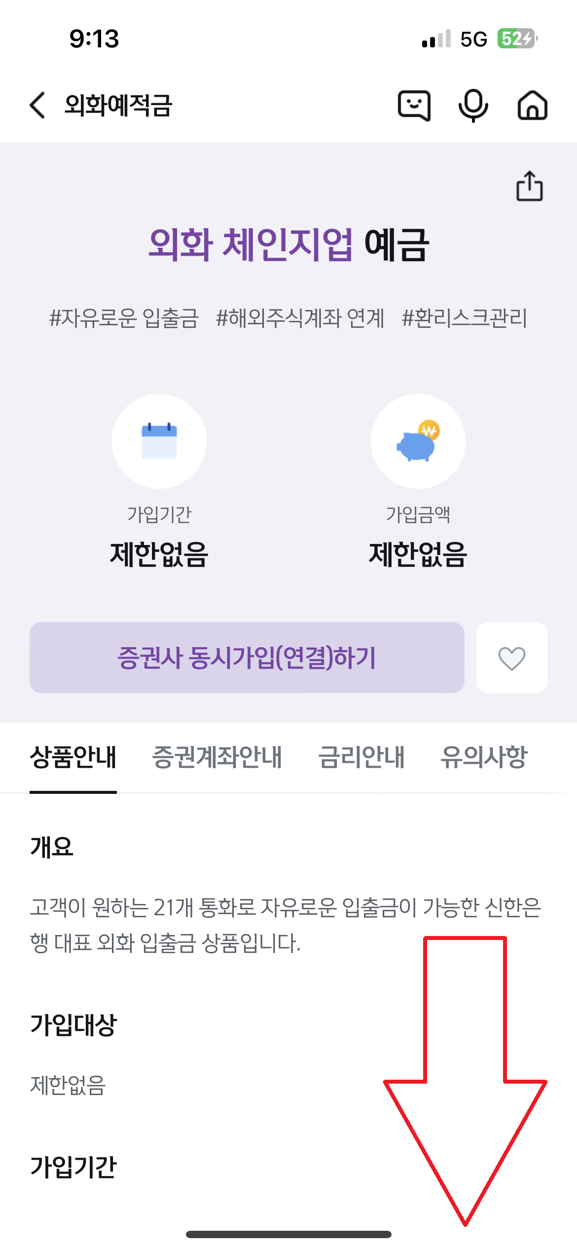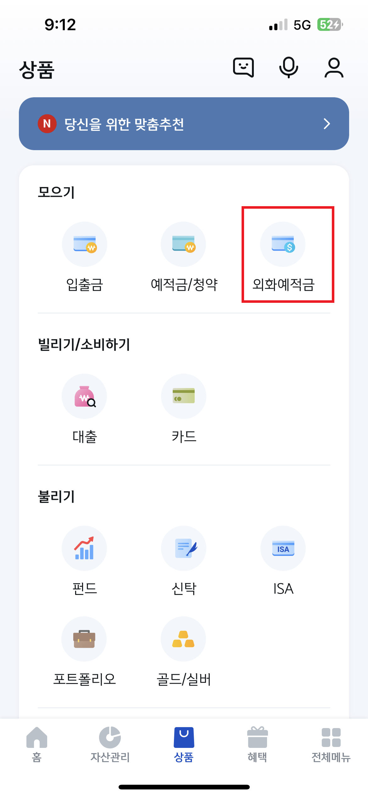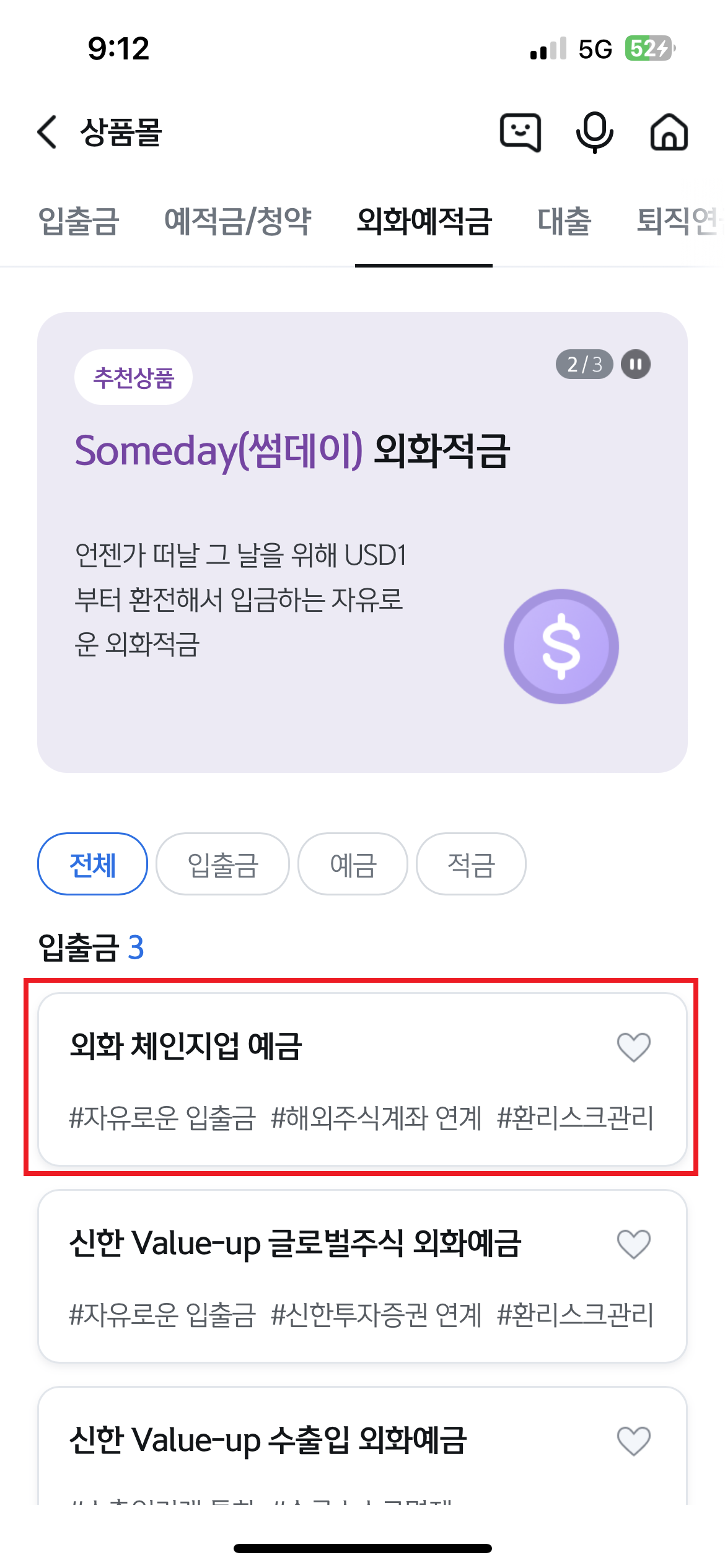 1) 신한은행 쏠 앱에서 로그인 한 후 하단메뉴 중 상품을 클릭 → 외화예적금 클릭 → 외화 체인지업 예금 클릭